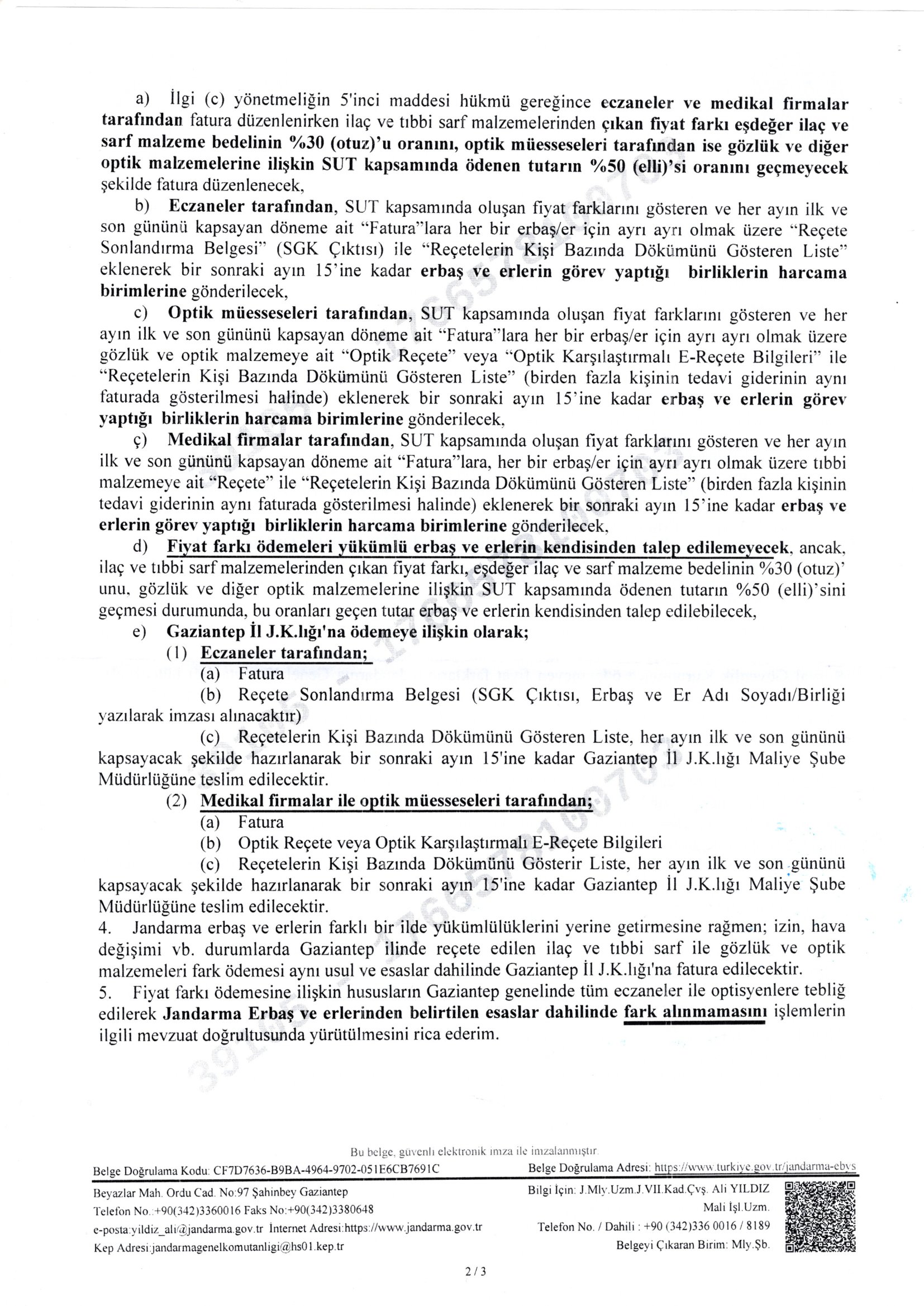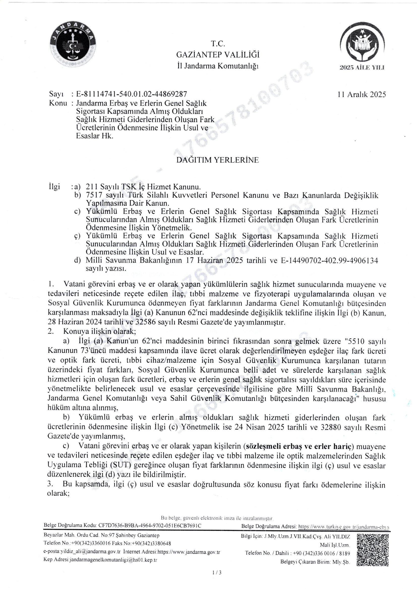 GEO DUYURULARI 26/12/2025 00:00Jandarma Erbaş ve Erlerin Genel Sağlık Sigortası Kapsamında Almış Oldukları Sağlık Hizmeti Giderlerinden Oluşan Fark Ücretlerinin Ödenmesine İlişkin Usul ve Esaslar Hk.