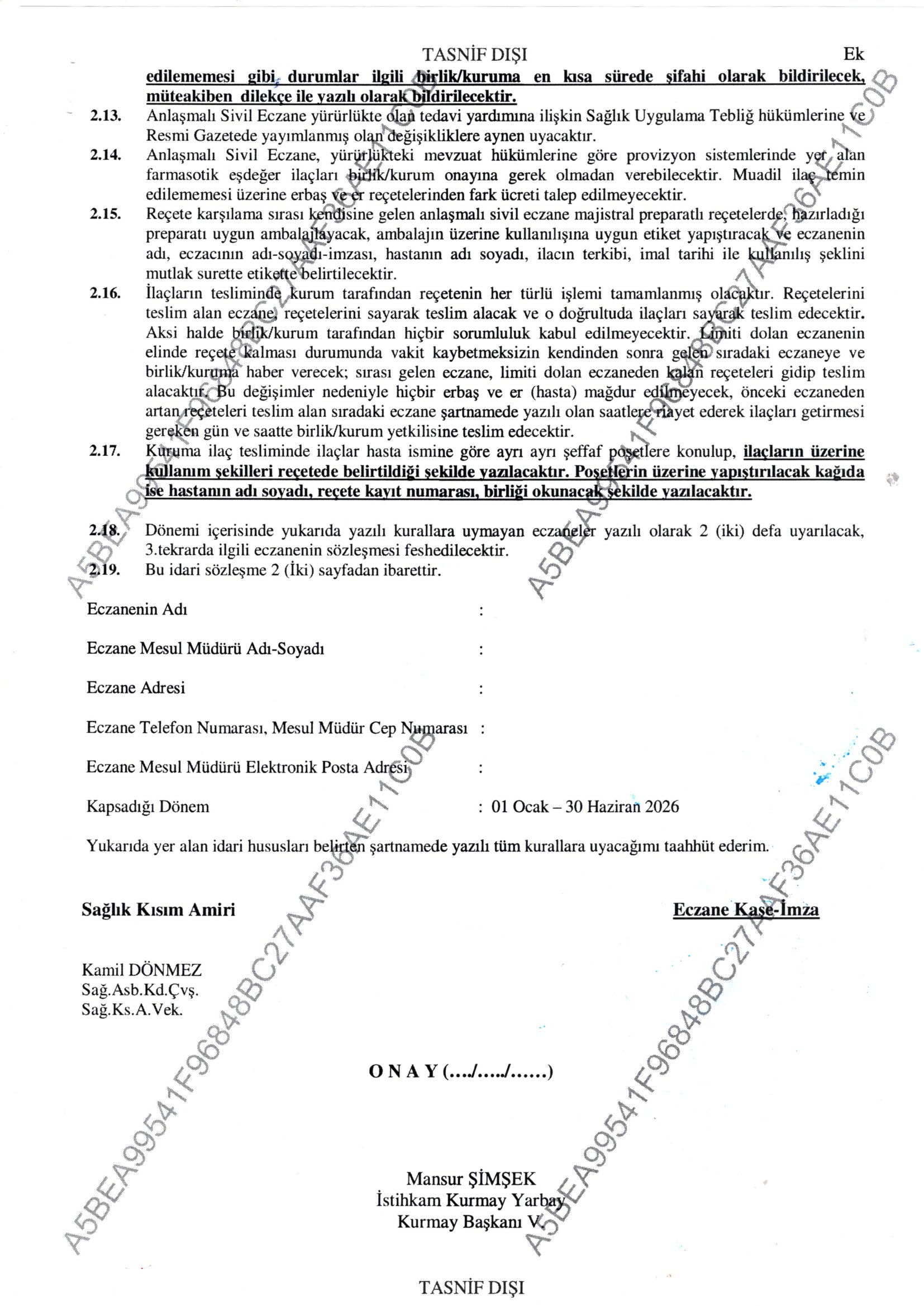 5.Zırhlı Tugay Komutanlığı Er-Erbaş reçetelerini karşılamak isteyen eczanelerin; 01 Ocak – 30 Haziran 2026 dönemini kapsayan sözleşmeleri için 05 Aralık 2025 tarihine kadar ekte bulunan İdari Şartname Sözleşmesi (2 nüsha halinde) ve kaşeleri ile beraber 5. Zırhlı Tugay Komutanlığı 1.Basamak Muayene Merkezi Baştabipliğine başvurmaları gerekmektedir.