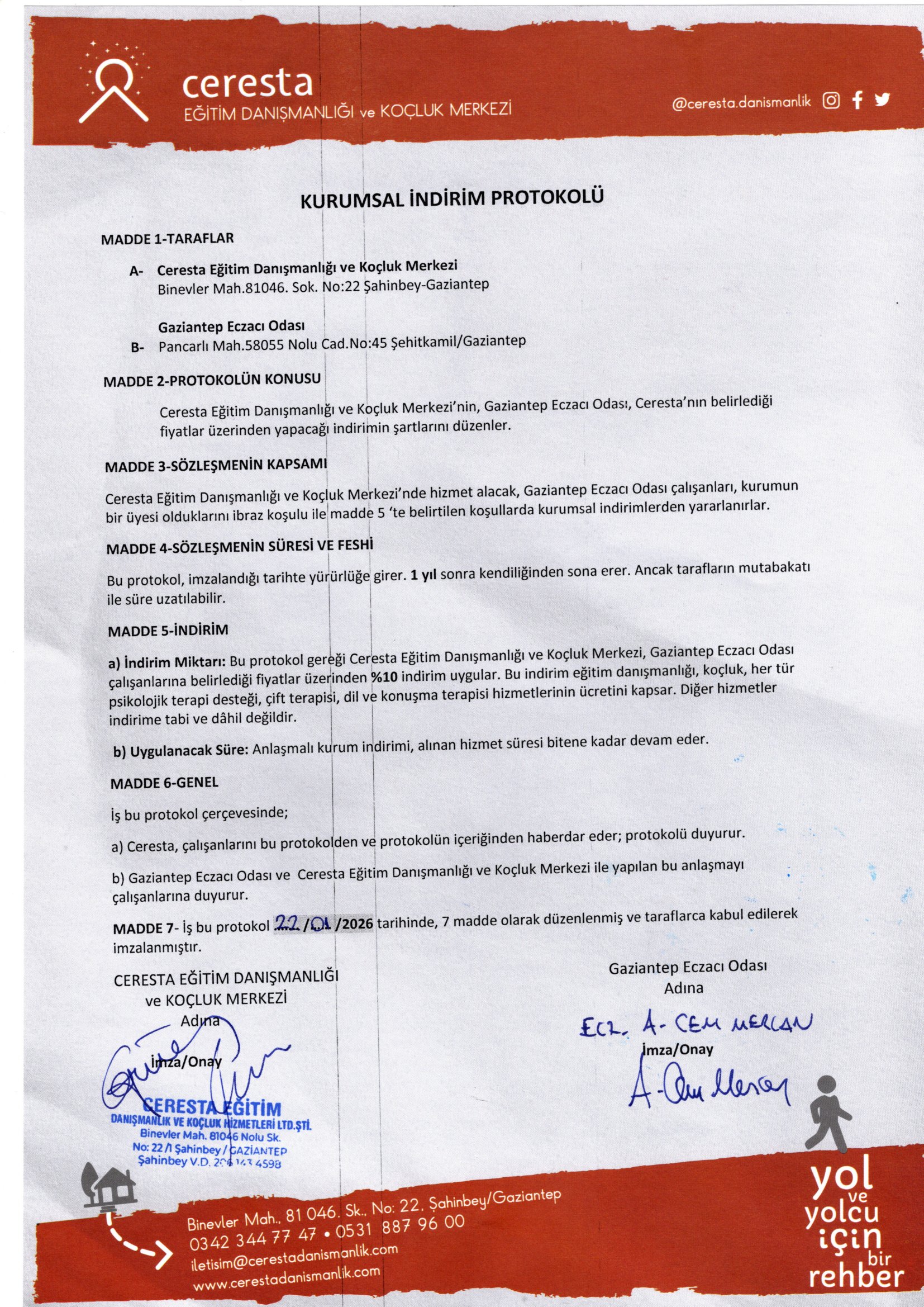 EĞİTİM - CERESTA EĞİTİM DANIŞMANLIĞI ve KOÇLUK MERKEZİ İNDİRİM PROTOKOLÜ HK.