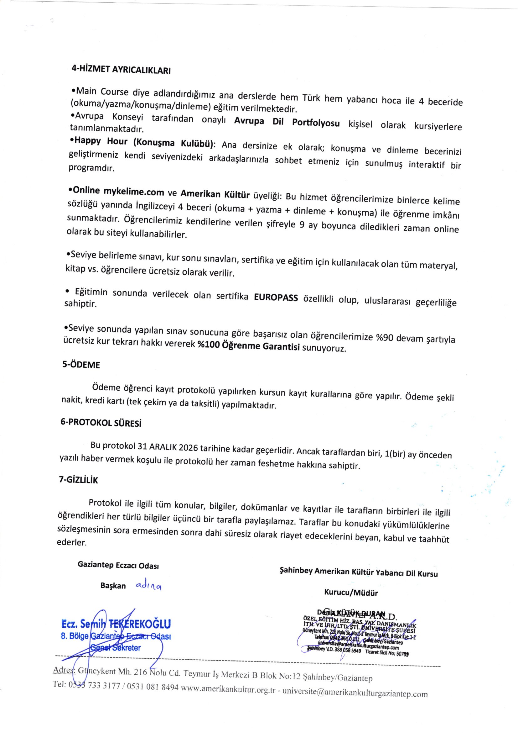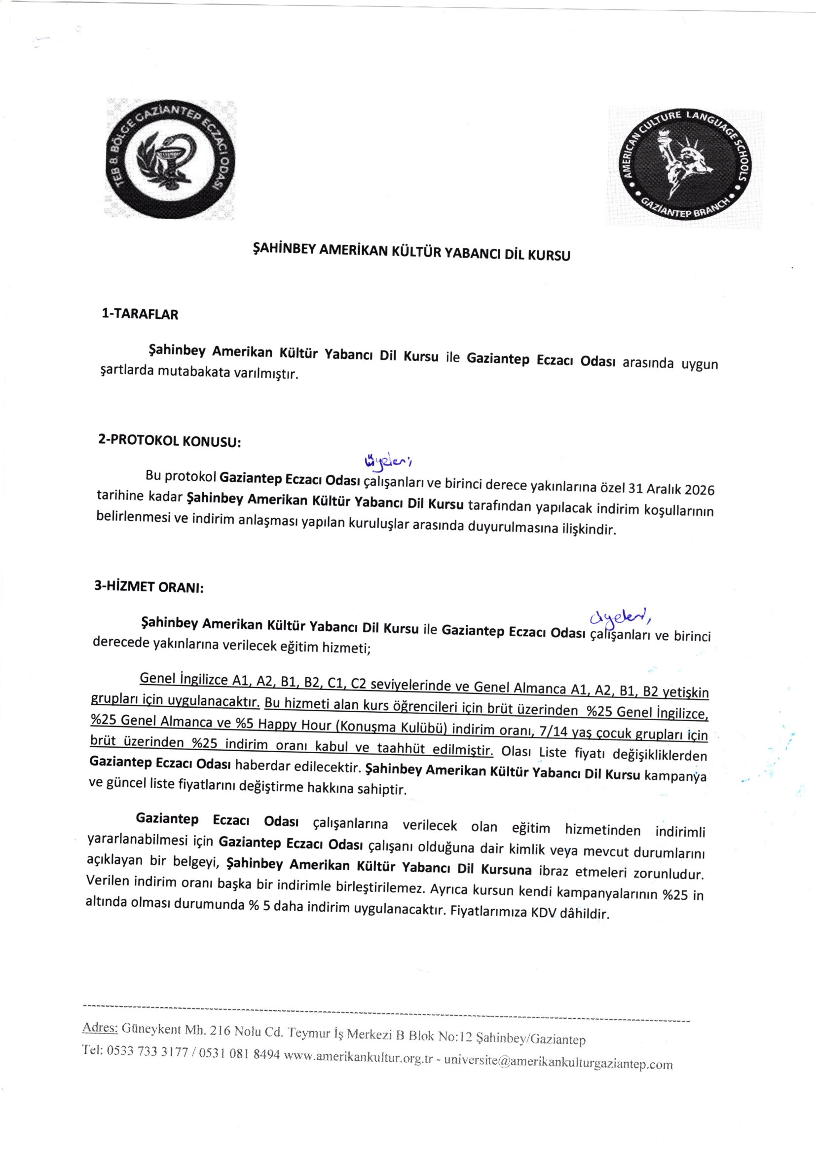 Şahinbey Amerika Kültür Koleji ile odamız arasında eczacı meslektaşlarımıza yönelik indirimler içeren protokol imzalanmıştır.