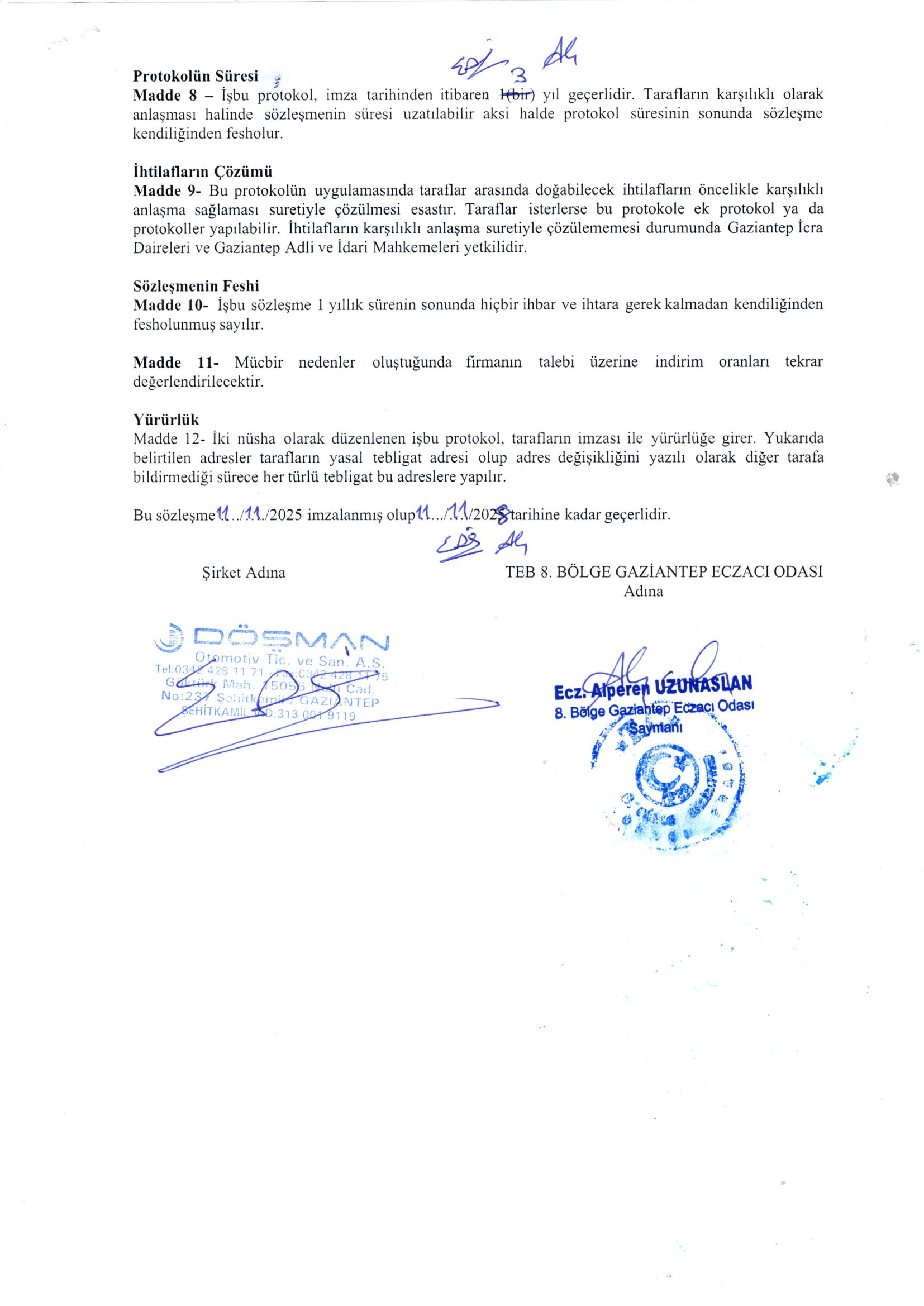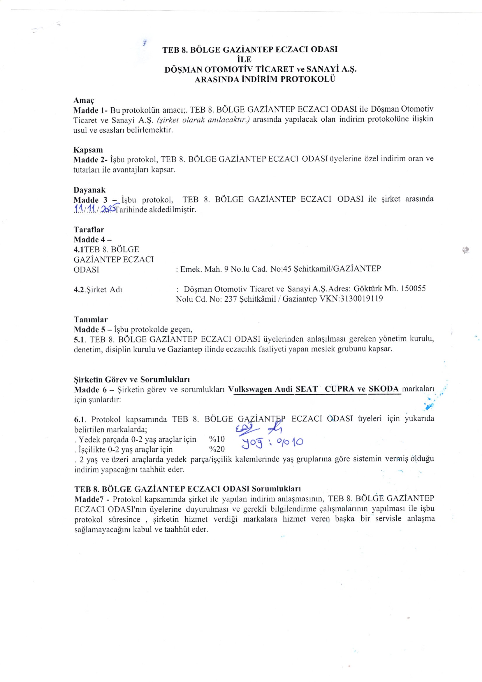 Döşman Otomotiv Ticaret ve Sanayi A.Ş ile odamız arasında eczacı meslektaşlarımıza yönelik indirimler içeren protokol imzalanmıştır.
